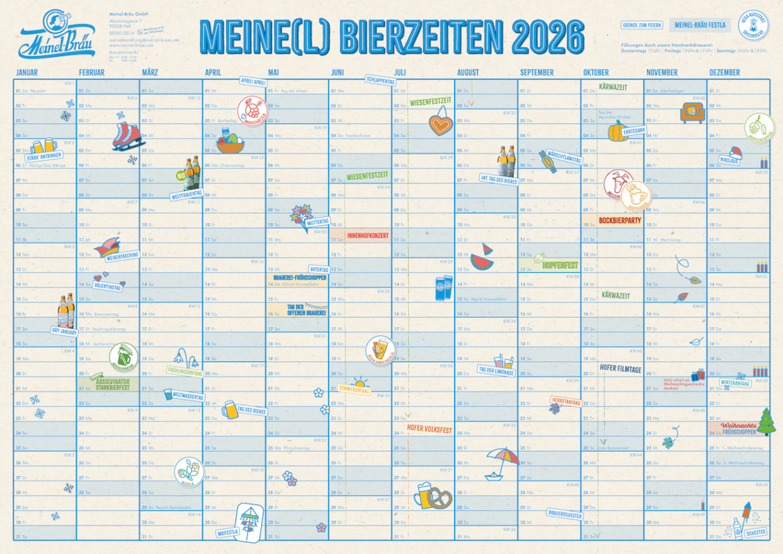 Wir freuen uns auf ein schönes, spannendes und feuchtfröhliches Jahr 2026 mit euch! Damit ihr nichts verpasst, haben wir die wichtigsten Meinel-Termine zusammengetragen. Events, Feste, Saisonbierstarts – alles was Spaß macht!